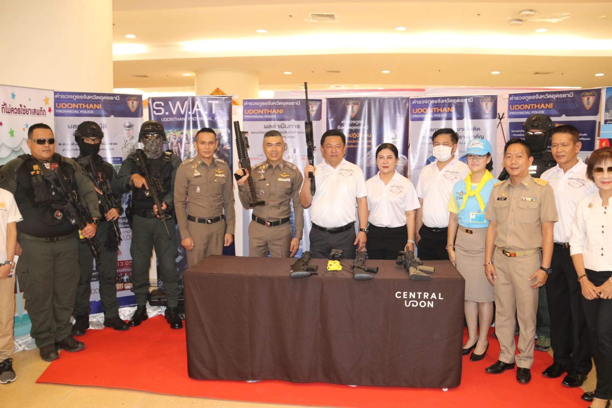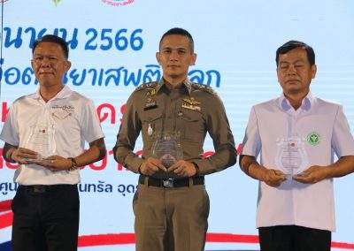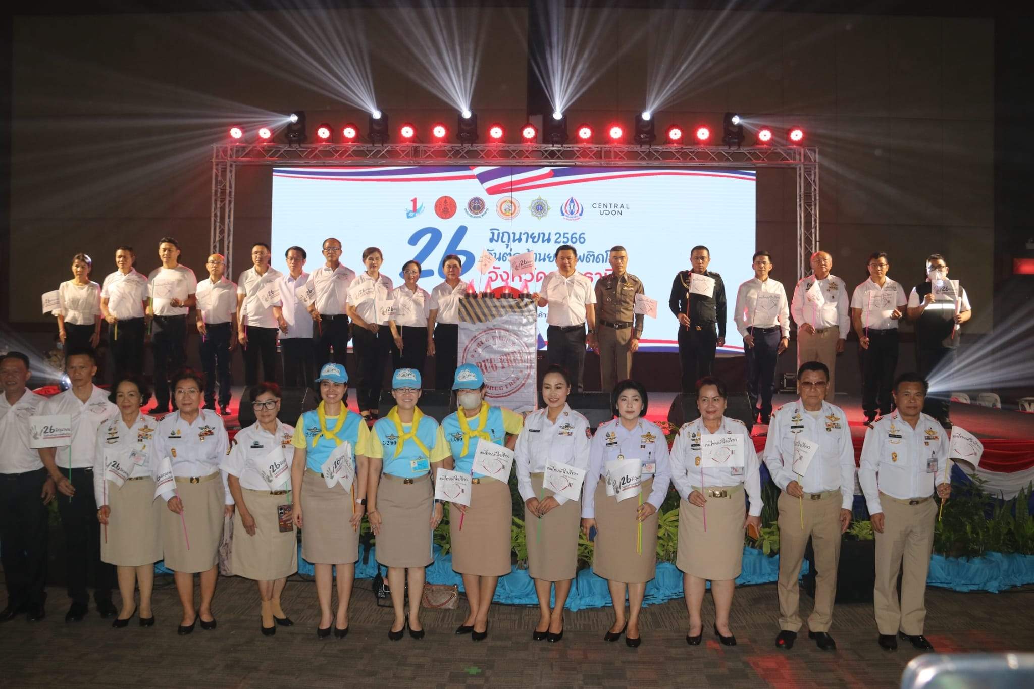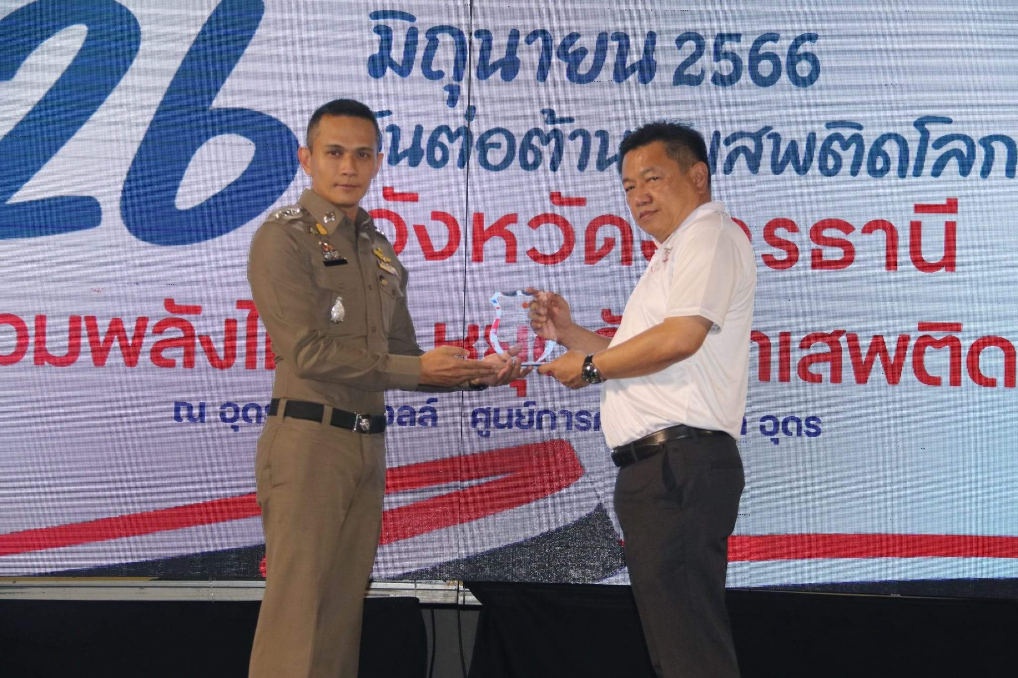 โดยมีนายวันชัย คงเกษม ผู้ว่าราชการจังหวัดอุดรธานี เป็นประธานเปิดงาน พร้อมนำผู้ร่วมกิจกรรมประกาศเจตนารมณ์ต่อต้านยาเสพติด เพื่อหมู่บ้าน/ชุมชนและประเทศชาติ ปลอดภัยจากยาเสพติดอย่างยั่งยืน, หัวหน้าส่วนราชการ หน่วยงานภาครัฐ รัฐวิสาหกิจ องค์กรปกครองส่วนท้องถิ่น ภาค เอกชน ประชาชน นักเรียนนักศึกษาร่วมกิจกรรมกว่า 5,000 คน ในกิจกรรมดังกล่าวนี้ ตำรวจภูธรจังหวัดอุดรธานีได้จัดบูธให้ความรู้เกี่ยวกับโทษของยาเสพติด และการป้องกันและปราบปรามยาเสพติด แก่เยาวชนและผู้เข้าร่วมงาน และยังได้รับรางวัลหน่วยงานป้องกันและปราบปรามยาเสพติดดีเด่น จากผู้ว่าราชการจังหวัดอุดรธานี ณ เซ็นทรัลฮอลล์ ชั้น4 ศูนย์การค้าเซ็นทรัลพลาซ่าอุดรธานี