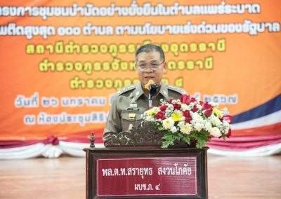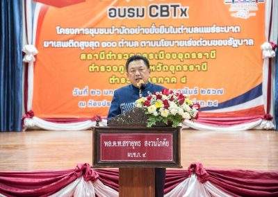 26 ม.ค.2567 เวลา 13.00 น. พล.ต.ท.สรายุทธ สงวนโภคัย ผบช.ภ.4 เป็นประธานเปิดการอบรมการบำบัด CBTx ชุมชนบำบัดอย่างยั่งยืนในตำบลแพร่ระบาดยาเสพติดสูงสุด 100 ตำบล (เทศบาลนครอุดรธานี 105 ชุมชน) ตามนโยบายเร่งด่วนของรัฐบาล โดยมี นายวันชัย คงเกษม ผู้ว่าราชการจังหวัดอุดรธานี พร้อมด้วย พล.ต.ต.สรรธาน อินทรจักร์ ผบก.ภ.จว.อุดรธานี, พ.อ.ธนาวีร์ วิชาชัย รอง ผอ.รมน.จังหวัด อ.ด. (ท.), พ.ต.อ.อนุศักดิ์ ศักดาวัชรานนท์ รอง ผบก.ภ.จว.อุดรธานี, พ.ต.อ.พันเพ็ชร เหล่ากำเนิดเพชร ผกก.กก.สส.ภ.จว.อุดรธานี, พ.ต.อ.พัฒนวงศ์ จันทร์พล ผกก.สภ.เมืองอุดรธานี ผู้แทนนายกองค์การบริหารส่วนจังหวัดอุดรธานี, ผู้แทนสาธารณสุขจังหวัดอุดรธานี, ผู้แทนเทศบาลนครอุดรธานี, ผู้นำชุมชน 105 ชุมชน และเจ้าหน้าที่ร่วมพิธีเปิด ณ หอประชุมสิริปุณโณเมตตา กก.ตชด.24 ค่ายเสนีย์รณยุทธ ต.หนองบัว อ.เมือง จ.อุดรธานี
